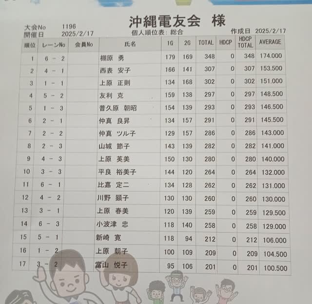 令和7年2月17日(月)那覇市サラダボウルにて、ボウルリング大会を開催しました。計17名(男8、女9)が参加し、日頃のリーグ戦の強者、何年か振りの方等々楽しい一時を過ごしました。