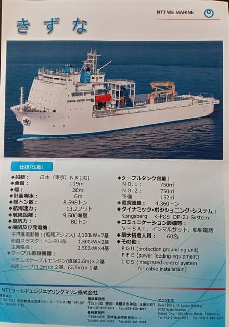 光ケーブル敷設船「きずな」船内見学 事務局からのお知らせ 2025.08.222025.11.06 2025年8月9日(土) 9時~ 場所:那覇埠頭 今回は、南北大東島間18Kmを敷設し、ループ化が完成する工事とのこと。今回、那覇港に寄港した機会に、応募した会員・家族20名余が参加し、船内にて光ケーブルの説明、敷設する装置(ロボット)など説明がありました。夏休みで、お土産付(ポロシャツ・キーホルダー)お孫さん達も喜んでいました。