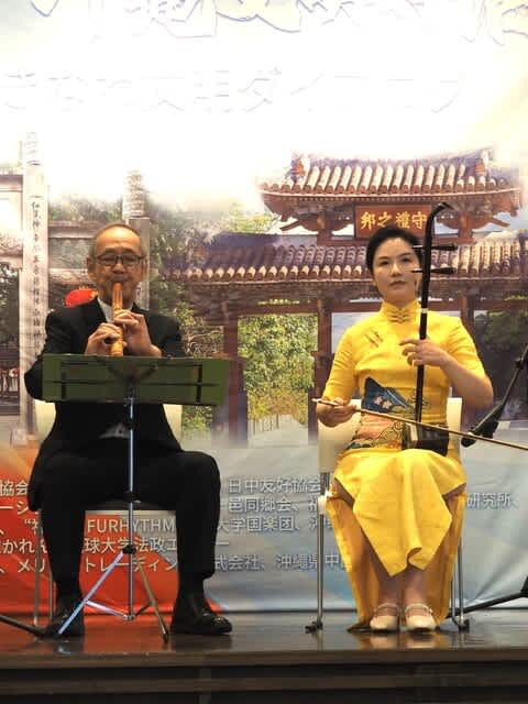 沖縄電友会から、仲本会長の尺八独奏・「涙そうそう」の二胡とのコラボ、三線サークル8名による古典斉唱3曲や三線・笛で「童神」を二胡とコラボ、音楽を通じて日中民間交流の一翼を担いました。