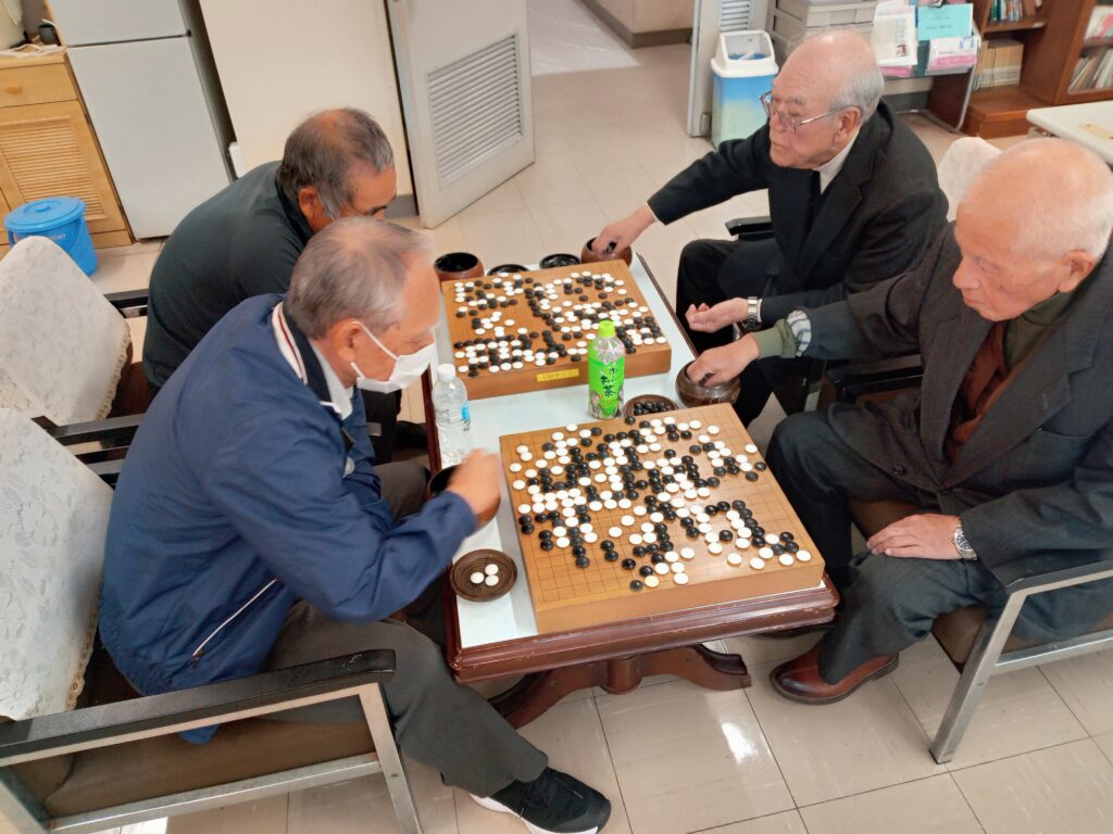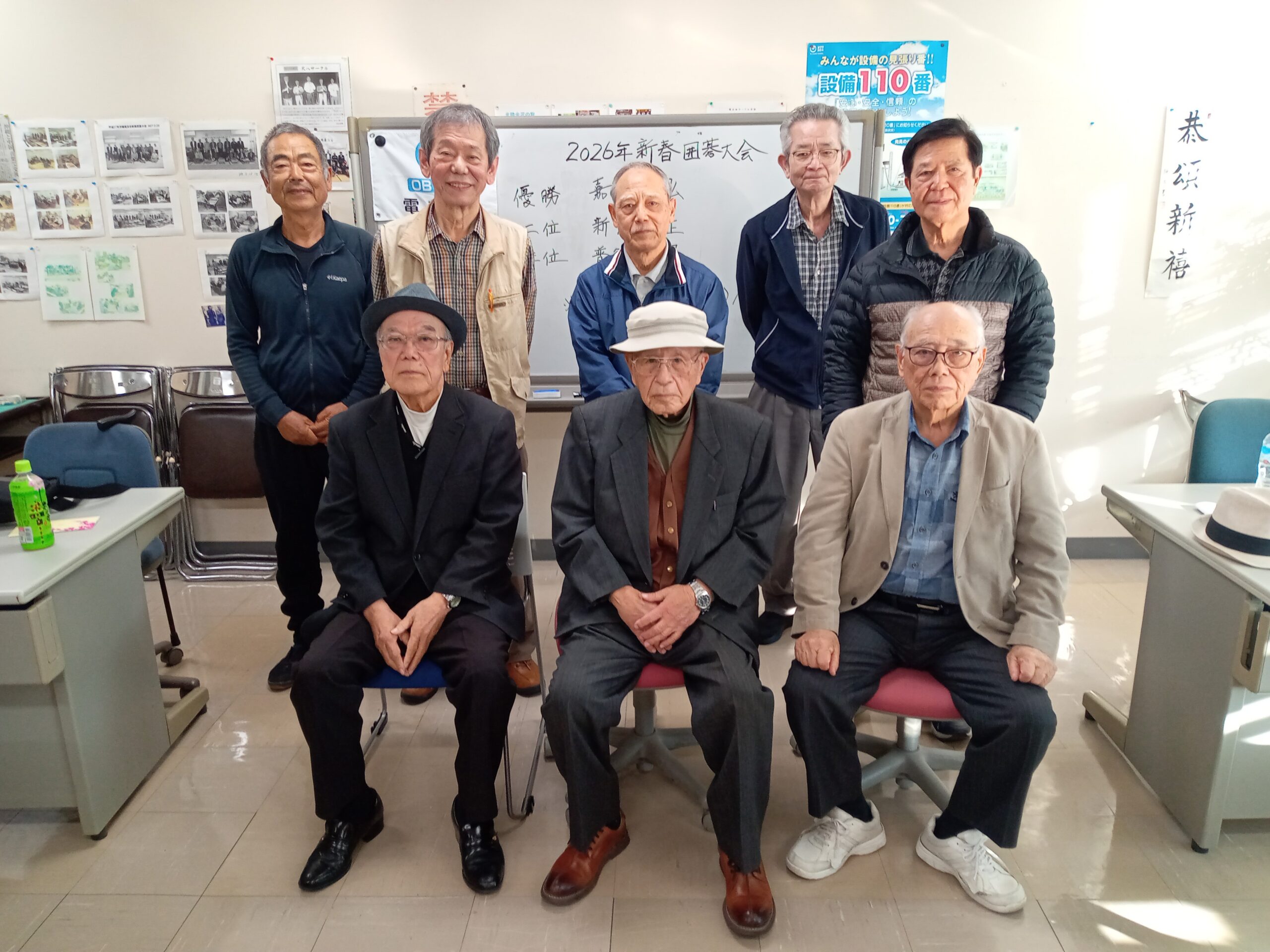 2026年新春囲碁大会開催 事務局からのお知らせ 2026.02.17 2月14日(土)午後1時からOBサロンにて囲碁大会を開催、8名が参加しトーナメント方式で熱戦を繰り広げた結果、嘉陽田弘さんが三戦全勝で見事優勝しました。惜しくも第二位は二勝一敗で新川善正さん、第三位は普久原朝昭さんでした。 前列左から、村吉政常さん、宮城章さん、嘉陽田朝正さん後列左から、玉那覇剛さん、普久原朝昭さん(第三位)、嘉陽田弘さん(優勝)、上原裕光さん、新川善正さん(第二位)